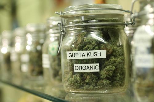 Cannabis flower displayed in jars at a Las Vegas dispensary serving recreational and medical marijuana customers.
